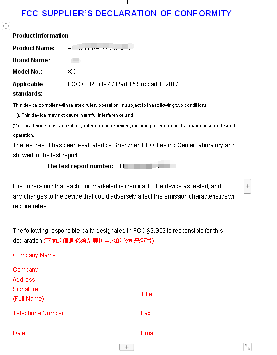之前產(chǎn)品辦理FCC VOC或者是FCC DOC認(rèn)證的時(shí)候,都是測(cè)試報(bào)告+證書的。而更新到FCC SDOC之后,不再有證書,而是測(cè)試報(bào)告+FCC SDOC聲明文件。FCC SDOC聲明文件樣件如下: