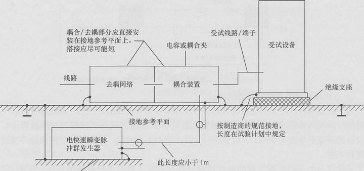 試驗(yàn)配置包括接地參考平面、耦合裝置〔網(wǎng)絡(luò)或耦合夾〉、去耦網(wǎng)絡(luò)、試驗(yàn)發(fā)射器等,