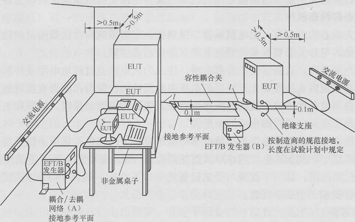 電快速瞬變脈沖群抗擾度試驗(yàn)可以分成在實(shí)驗(yàn)室進(jìn)行的試驗(yàn)和在設(shè)備最終安裝條件下對設(shè)備進(jìn)行的安裝后試驗(yàn)。優(yōu)先采用實(shí)驗(yàn)室進(jìn)行的試驗(yàn)。