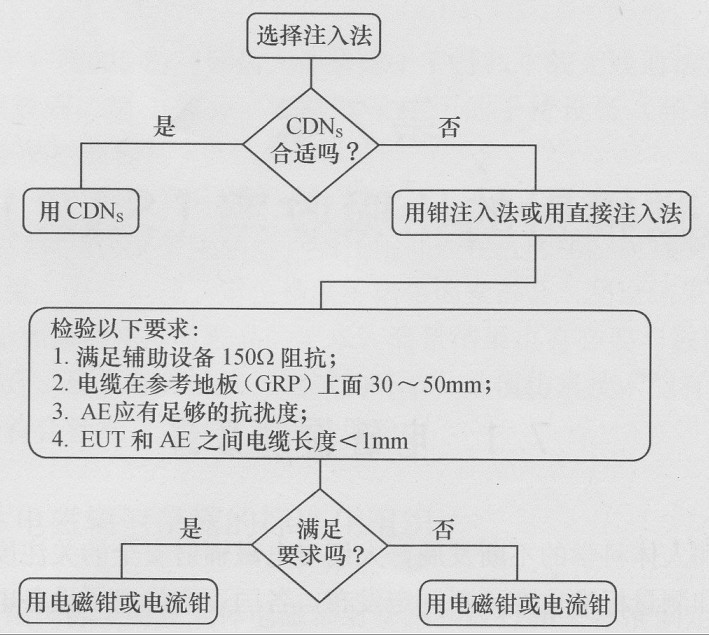 以上為共模注入騷擾信號的方法,共模注入點是指受試設(shè)備注入騷猶信號的點,對連接電纜而言是電纜的屏蔽層,對非屏蔽饋線(如電源線)是指注入網(wǎng)絡(luò)中RC線路與每根線相交的點。