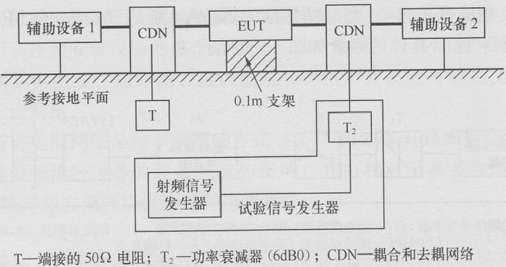 受試設(shè)備應(yīng)放在參考接地平面上面0.1m高的絕緣支架上,將合適的耦合和去親裝置提 供給全部有關(guān)電纜。裝置與參考接地平面上受試設(shè)備的幾何投影在0.1-0.3m范圍內(nèi)。對屏蔽電纜是將騷擾信號電流注人到電纜的屏蔽層,對非屏蔽電纜是將騷擾信號通過耦合和去耦網(wǎng)絡(luò)(CDN)注入各條饋線上。射頻傳導(dǎo)騷擾抗擾度試驗配置如圖2所示。