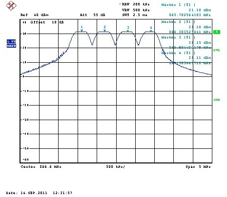 下面針對(duì)一款掃描機(jī)的測(cè)試進(jìn)行介紹,該產(chǎn)品調(diào)制方式為ASK,功率為30±3dBm,有效工作頻點(diǎn)為:865.7MHz,866.3MHz,866.9MHz,867.5MHz。