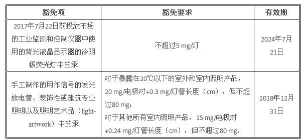2014年5月20日,歐盟在其官方公報(bào)上正式發(fā)布了RoHS指令的八項(xiàng)豁免,其中與照明設(shè)備相關(guān)的豁免有兩項(xiàng):