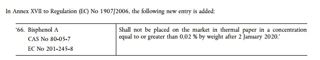 雙酚A(Bisphenol A) CAS NO 80-05-7 ,EC No 201-245-8 在2020年1月2日之后,雙酚A濃度等于或大于0.02%(按重量計(jì))的熱敏紙不能投放到市場(chǎng)上