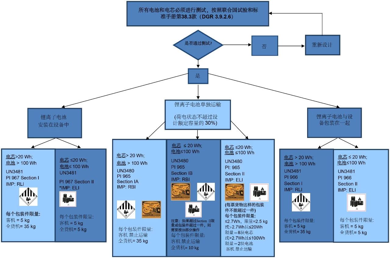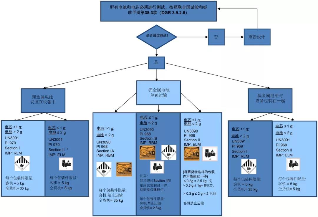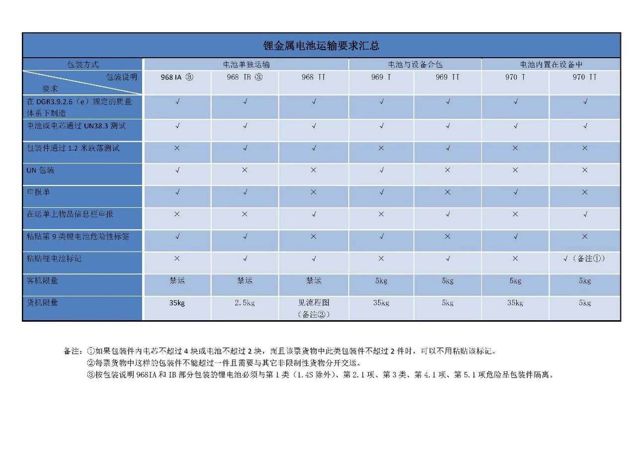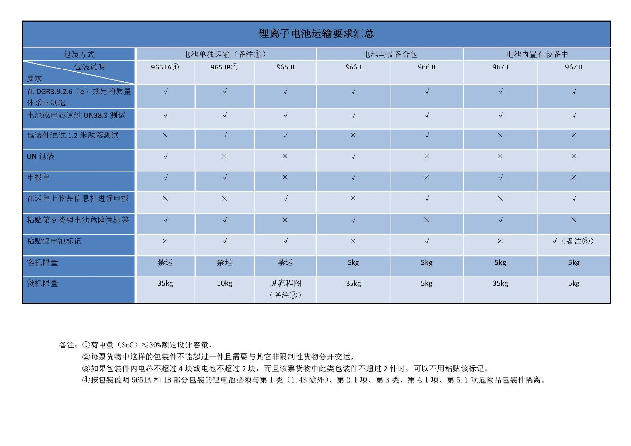 附圖是鋰電池在空運(yùn)中的分類規(guī)則以及各種鋰電池在不同運(yùn)輸方式下的要求匯總。